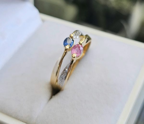 Bague en or jaune 18k avec 1 Saphir bleu et 1 Saphir rose et 0.016 carats de Diamants en Taille 54 à 138000F.