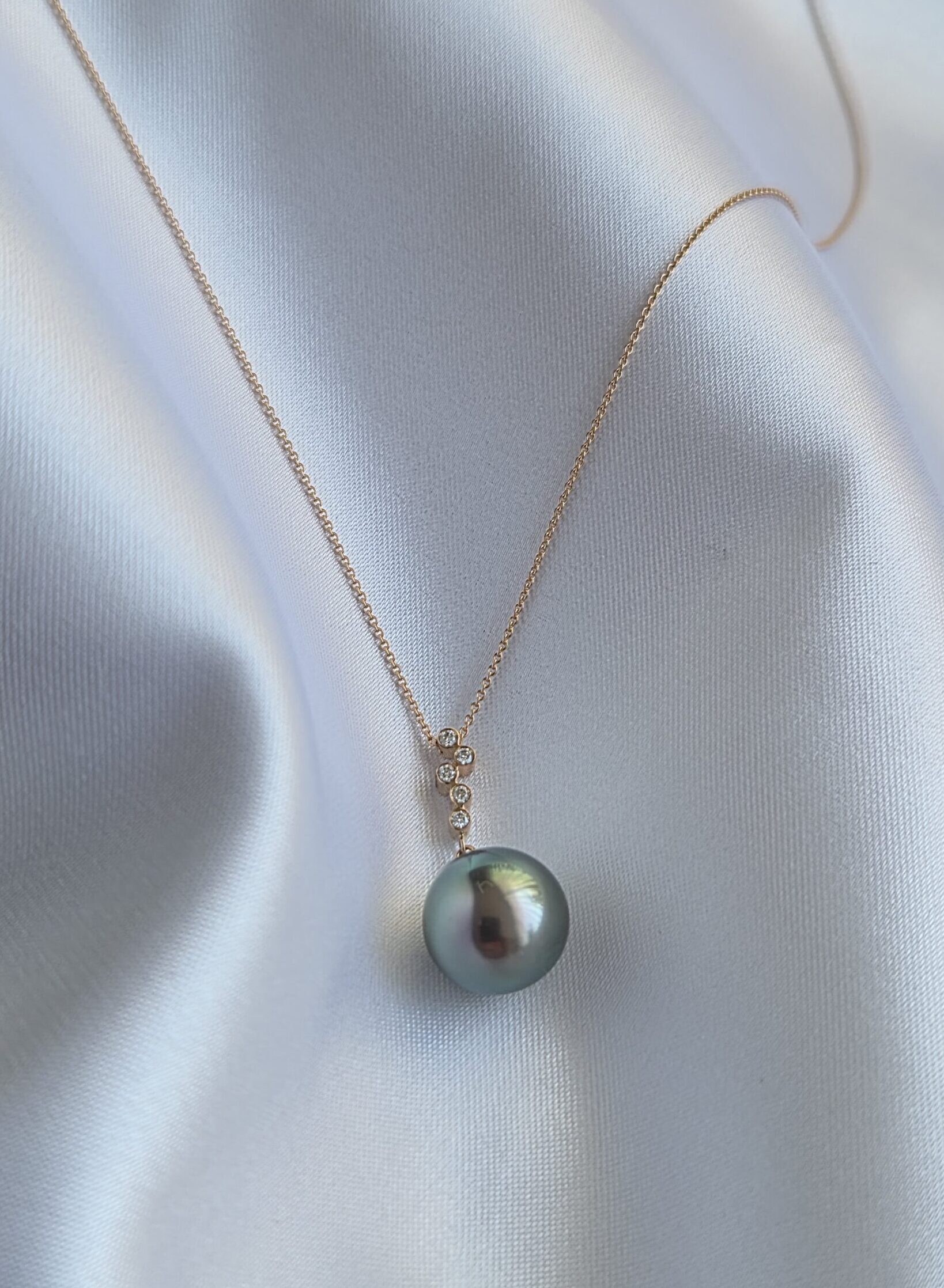 Collier en or rose 18k de 45 cm avec une perle de Tahiti de 9mm, Catégorie A, aux reflets bleu-vert, et 5 diamants naturels d’un total de 0,050 carat.